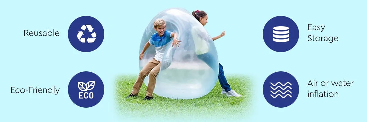 ENCOURAGE YOUR CHILD TO PLAY OUTDOORS AND INTERACT WITH OTHERS:This Giant Jelly Balloon Ball features the perfect design for interactive playtime outdoors. With a super versatile design, it's ideal for playing games between family and friends. Fill it up with water or air and use it for kicking, punching, throwing, and even sitting outside and indoors. This toy is the perfect solution for getting some exercise while still having fun!