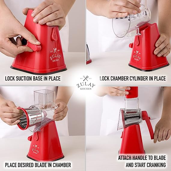 - EASY TO USE, EASY TO CLEAN: The Kitchen Rotary Cheese Grater is constructed with 2 Built-In locks that seals the handle and chamber. All items are easily detachable for simple and easy clean up.