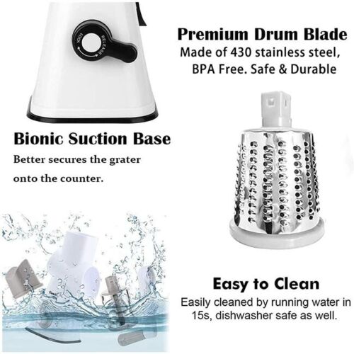 - EASY TO ASSEMBLE AND INSTALL: It for Kitchen features 3 food grade stainless steel drum blades with unique patterns; It is perfectly designed to assemble and disassemble and allows for plenty of space to keep your hands away from the sharp blades while grating.