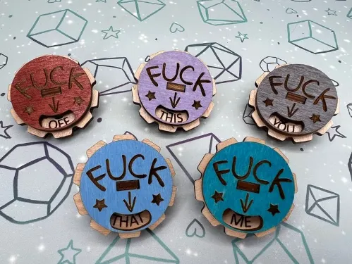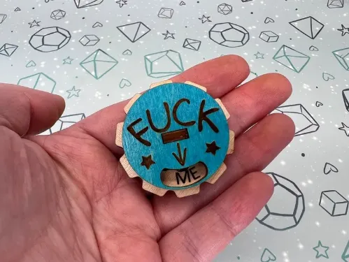 Then this dial pin is the one for you. Turn the wooden dial to change if you want it to say Fuck Me, Fuck You, Fuck Off, Fuck This and Fuck That.